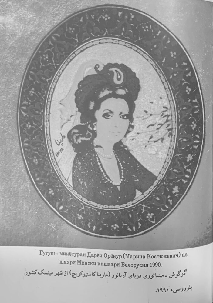 در بارۀ آشناییام با «دریای آریانور» (مارینا کاستیوکویچ) توسط ترانههای دلانگیز او صحبت میکنم. در شگفت میماند و از این دختر هنرمند بلاروسی سوالها میکند. ولی افسوس من آن مینیاتور گوگوش را که مارینا با یک اخلاص صمیمانه و استعداد بلند آفریده بود، با خود نگرفته بودم تا منظور او گردانم. در آمد گپ باید بگویم که نسخۀ اسلاید این اثر مارینا را مجلۀ هفتهای «جوانان» که در لوس آنجلس چاپ میشود، در روی جلد نخست خود جای داده زیرش چنین نگاشته بود: «گوگوش در لباس تاجیکستانی».